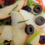 Simple ingredients put together with an eye for color and a dressing to enhance their natural flavors can be a wonderful combination. Sliced fruit, a sprinkling of fresh herbs and olives make a delightful start to a meal.