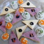 - Cream cheese flavoured with fresh finely chopped herbs, grated carrots or radish mixed with chopped nuts, guacamole ( avocado), diced and sautéd mushrooms, finely chopped coloured peppers, cherry tomatoes, cheese topped with olives, etc.