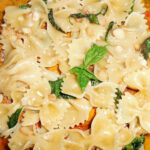The Farfalle (literally butterflies- bow shaped pasta) can be replaced with any pasta that is readily available, spaghetti, penne, fettucine etc. I have used parmesan cheese but any finely grated hard cheese can be substituted.