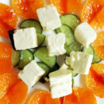 Oranges are so refreshing and juicy when in season. This is a very simple salad and needs only cucumbers and dressing and of course the oranges. It is colorful and the feta cheese with its salty taste because it is aged in brine, contrasts so well with oranges.