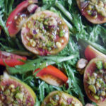 This is a favorite salad of mine which I had at an Italian restaurant. I have tweaked it a bit to make my own version. The fig halves covered with crushed pistachios are a visual treat and are also delicious. I have used Frisee salad leaves which have a slightly bitter taste and are feathery but any lettuce will do.