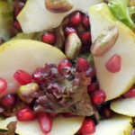 This is a salad made from ingredients which are predominantly Mediterranean. Ruby red , delicious pomegranates are powerful antioxideants and loaded with nutrients. Pistachios or Pistas originating from Central Asia and Middle East, also come from the Mediterranean and are loaded with nutrients. They control cholesterol levels and are a crunchy colorful addition for salads. Thinly sliced pears used in this recipe boost the immune system. Served on Lollo Rossa lettuce or any other lettuce of your choice this salad makes a refreshing and healthy addition to any meal.