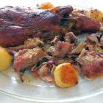 - Slice/Carve one leg and discard the bone. Place the other full leg of lamb in a platter and surround with the sliced/carved meat and roast potatoes.