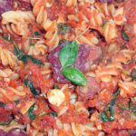 - Mix cooked pasta with the seasoned tomato, basil sauce and salami.