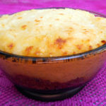 Shepherd’s Pie is an English dish, traditionally made with beef or lamb/mutton.  It is essentially a casserole with cooked meat and vegetables, topped with mashed potatoes, and baked. Some versions do not include vegetables. The ground meat is cooked with onions, ginger and garlic and fresh herbs in my version to make the pie more aromatic. The original English recipe is often made without these additions but the flavor is much better this way.