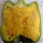 - Cut the capsicums into two pieces each vertically after partially removing the stem. Discard the pith and seeds. Fill with the potato mixture.